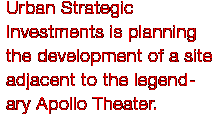 Urban Strategic Investments is planning the development of a site adjacent to the legendary Apollo Theater and diagonally across from Harlem USA. The infill site will include at least two levels of retail space fronting on 125th Street and additional space to accommodate the expansion of the Apollo Theater. This additional commercial component, to be purchased by the theater, will more than double the Apollo’s exposure on 125th Street and provide needed expansion space for this world-famous institution.