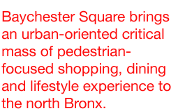 Baychester Square is a unique retail destination located on approximately 12 acres at the intersection of the New England Thruway, the Hutchinson River Parkway and East Gun Hill Road. The project brings an urban-oriented critical mass of pedestrian-focused shopping, dining and lifestyle experience to the north Bronx. The project will contain approximately 395,000 square feet with approximately 4,000 linear feet of transparent storefronts at grade. The ground level will consist of smaller specialty retailers, a variety of dining options and entries to larger format retailers located on the second level. The project's urban design consists of eight independent buildings that are separated by two pedestrian-only streets running in the east-west direction and a wider central pedestrian-only street running in the north-south direction. The streets and the two squares at their intersection provide for more than an acre of publicly accessible open space. The project will have approximately 1,170 parking spaces divided equally between indoor and outdoor spaces. The project, being designed by BLT Architects, will seek LEED certification and is currently going through ULURP, New York City's discretionary project approval process. Completion is expected by the second half of 2019.